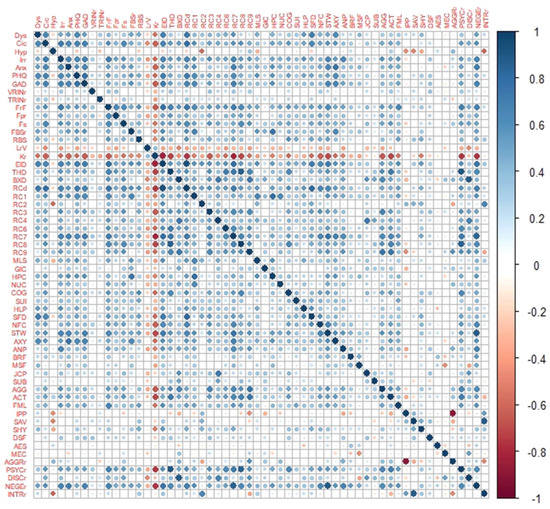 Figure 3. TEMPS–A, PHQ–9, GAD-7 and MMPI–2–RF score correlation matrix. TEMPS–A: Temperament Evaluation of Memphis, Pisa, Paris and San Diego Autoquestionnaire; PHQ–9: Patient Health Questionnaire; GAD–7: General Anxiety Disorder; MMPI–2–RF: Minnesota Multiphasic Personality Inventory–II Restructured Form; DYS: dysthymic; CYC: cyclothymic; HYP: hyperthymic; IRR: irritable; ANX: anxious; VRINr: variable response inconsistency; TRINr: true response inconsistency; FrF: infrequent responses; Fpr: infrequent psychopathology responses; Fs: infrequent somatic responses; FBSr: symptom validity; RBS: response bias scale; LrV: uncommon virtues; Kr: adjustment validity; EID: Emotional/Internalizing Dysfunction; THD: Thought Dysfunction; BXD: Behavioral Externalizing Dysfunction; RCd: demoralization; RC1: somatic complaints; RC2: low positive emotions; RC3: cynicism; RC4: antisocial behavior; RC6: ideas of persecution; RC7: dysfunctional negative emotions; RC8: aberrant experiences; RC9: hypomaniac activation; MLS: malaise; GIC: gastrointestinal complaints; HPC: head pain complaints; NUC, neurological complaints; COG: cognitive complaints; SUI: suicidal death ideation; HLP: helplessness, hopelessness; SFD: self-doubts; NFC: inefficacy; STW: stress, worry; ANX: anxiety; ANP: anger proneness; BRF: behavior-restricting fears; MSF: multiple specific fears; FML: family problems; IPP: interpersonal passivity; AV: social avoidance; SHY: shyness; DSF: disaffiliativeness; AES: aesthetic–literary interests; MEC: mechanical-physical interests; AGGR–r: aggressiveness; PSYC–r: psychoticism; DISC–r: discontraint; NEGE–r: negative emotionality, neuroticism; INTR–r: introversion, low positive emotionality.