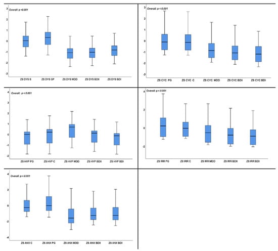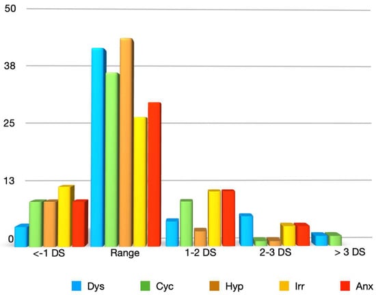 Figure 5. Variance in the temperament scores compared to the mean scores of a large general population sample [35]. DYS: dysthymic; CYC: cyclothymic; HYP: hyperthymic; IRR: irritable; ANX: anxious.