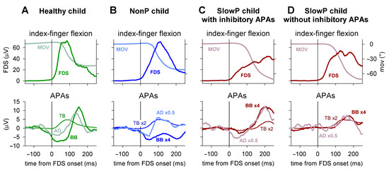 Among SlowP children, only two showed inhibition in both BB and AD; two showed inhibition only in BB, while in the remaining children the inhibitions were completely undetectable. A Fisher’s exact test revealed that the occurrence of these APAs was significantly lower in SlowP vs. H children (p = 0.0054 for BB, p = 0.0004 for AD). Note that the time courses of both FDS recruitment and index finger kinematics were comparable in H and NonP children (Figure 2A,B), while they were somewhat longer in SlowP children (Figure 2C,D).
