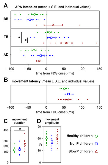 Individual values of APA latencies, together with their means and standard errors, are plotted in Figure 3A. No significant (see below) time differences occurred in BB, TB and AD APAs between NonP and H children (blue squares vs. green circles, respectively), although two NonP children did not show inhibitory APAs in AD. With regard to SlowP children (brown symbols), the data about the inhibitory APAs in AD (two out of ten subjects) clearly do not represent the population’s behavior. A similar consideration should be drawn for BB (four out of ten subjects); however, note that APAs developing in this muscle were clearly delayed. For TB APAs, which were detected in all participants, it is apparent that they were delayed in SlowP children (about 50 ms), with respect to both H and NonP. It is important to note the larger variability of latencies in SlowP vs. H participants, especially in TB where there were no missing data.