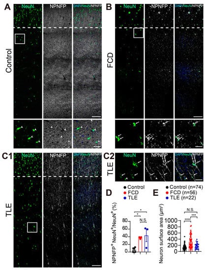 Figure 2. Increased NPNFP expression in interstitial neurons in the white matter of drug-resistant epilepsy patients. (A) Tile scan images and zoom-in images (bottom) showing the expression of NPNFP in interstitial neurons in the white matter of brain tissue sections from 3 independent samples of control, FCD (B), and TLE (C1, tile scan image; C2, zoom-in image). Arrows indicate the co-expression of NPNFP with NeuN. Arrowheads indicate that no NPNFP expression was detected in the interstitial neurons. Scale bar, 200 μm in the tile scan image (up) and 50 μm in zoom-in image (bottom). A dashed line indicates the border between gray matter and white matter. NPNFP: non-phosphorylated neurofilament protein marker, SMI311. (D) Statistics showing the proportion of NPNFP-positive neurons within the total interstitial neurons of brain tissue sections from control, FCD, and TLE (SD: control = 5.87, FCD = 2.82 and TLE = 28.79), respectively. Data are presented as the mean ± SEM. (E) Statistics showing the surface area of interstitial neurons in the white matter (SD: control = 78.92, FCD = 200.37 and TLE = 94.31). Data are presented as the mean ± SEM. **** p < 0.0001, *** p < 0.001, * p < 0.05, N.S., no significance; one-way ANOVA with Tukey’s multiple comparisons test.