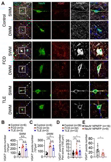 Next, we examined whether the interstitial neurons in the white matter could receive synaptic inputs by immunostaining with GABAergic presynaptic marker, vesicular GABA transporter (VGAT), and glutamatergic presynaptic marker vesicular glutamate transporter 1 (VGLUT1). We found expression of both VGAT and VGLUT1 synaptic puncta in the white matter of human brain tissue (Figure 3 and Figure 4). Intriguingly, VGAT synaptic puncta were distributed in the peri-soma and dendrites of NPNFP-expressing interstitial neurons in the white matter of drug-resistant epilepsy patients (Figure 3A). We also found a significant increase in the density of VGAT-positive synaptic puncta in both the superficial white matter (SWM) of FCD (Control: 103.91 ± 38.15 per 104 μm2, n = 6; FCD: 257.11 ± 19.44 per 104 μm2, n = 3, p < 0.05; TLE: 194.55 ± 38.19 per 104 μm2, n = 3. Control vs. TLE, p = 0.0938; FCD vs. TLE, p = 0.6722) and the deep white matter (DWM) of FCD and TLE compared with control brain samples (Control: 59.68 ± 10.37 per 104 μm2, n = 6, p < 0.01; FCD: 204.48 ± 20.24 per 104 μm2, n = 3, p < 0.001; TLE: 160.10 ± 23.66 per 104 μm2, n = 3, p = 0.1965; one-way ANOVA with Tukey’s multiple comparisons test) (Figure 3A–C and Figure S3). In addition, the number of VGAT-positive puncta on the peri-soma region of the interstitial neurons of brain tissue sections from FCD and TLE was significantly higher than that in control brain samples (Control: 5.66. ± 1.64 per 100 μm2, n = 38 from 6 samples, p < 0.05; FCD: 8.76 ± 2.62 per 100 μm2, n = 32 from 3 samples, p < 0.01; TLE: 9.29 ± 2.42 per 100 μm2, n = 12 from 3 samples, p = 0.9103; one-way ANOVA with Tukey’s multiple comparisons test) (Figure 3A,D and Figure S3). Furthermore, we found that the number of VGAT-positive puncta distributed in the peri-soma of the NPNFP-positive interstitial neurons of brain tissue sections from FCD and TLE were significantly higher than that in NPNFP-negative interstitial neurons (NeuN+ NPNFP+: 29.50 ± 9.69, n = 16 cells from 6 samples; NeuN+ NPNFP: 14.78 ± 4.66, n = 9 cells from 6 samples. p < 0.05. Unpaired two-tailed Student’s t-test). (Figure 3A,E and Figure S3).