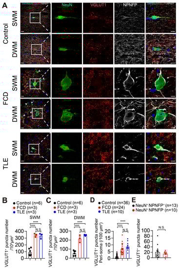 We next quantified the expression of the glutamatergic synaptic marker VGLUT1 in the interstitial neurons in the white matter. We found an increased density of VGLUT1-positive synaptic puncta in both the superficial white matter (SWM) (Control: 93.47 ± 30.17 per 104 μm2, n = 6, p < 0.0001; FCD: 343.02 ± 14.70 per 104 μm2, n = 3, p < 0.0001; TLE: 334.94 ± 22.91 per 104 μm2, n = 3, p = 0.9736) and the deep white matter (DWM) of FCD and TLE in comparison with control brain samples (Control: 57.32 ± 15.87 per 104 μm2, n = 6, p < 0.0001; FCD: 215.58 ± 22.81 per 104 μm2, n = 3, p < 0.0001; TLE: 253.62 ± 4.16 per 104 μm2, n = 3, p = 0.2680; one-way ANOVA with Tukey’s multiple comparisons test) (Figure 4A–C and Figure S4). The number of VGLUT1-positive puncta in the peri-soma region of interstitial neurons of brain tissue sections from FCD and TLE were significantly higher than that from control brain samples (Control: 1.46 ± 0.84 per 100 μm2, n = 36 from 6 samples, p < 0.0001; FCD: 6.75 ± 2.06 per 100 μm2, n = 24 from 3 samples, p < 0.0001; TLE: 8.84 ± 1.86 per 100 μm2, n = 10 from 3 samples, p = 0.0937. One-way ANOVA with Tukey’s multiple comparisons test) (Figure 4A,D and Figure S4). We also found the number of VGLUT1-positive puncta distributed in the peri-soma of NPNFP-positive interstitial neurons of brain tissue sections from FCD and TLE showed no difference in comparison with NPNFP-negative interstitial neurons (NeuN+ NPNFP+: 21.38 ± 13.11, n = 13 cells from 6 samples; NeuN+ NPNFP: 16.89 ± 3.81, n = 10 cells from 6 samples. p = 0.4229. Unpaired t-test) (Figure 4A,E and Figure S4). These results revealed the increased synaptic density of glutamatergic and GABAergic synapses in the white matter of drug-resistant epilepsy patients.