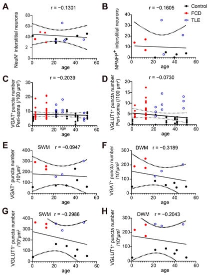 An increased number of heterotopic interstitial neurons was identified in the temporal lobe as compared to frontal or occipital cortical white matter [3,32]. Additionally, the number or distribution of interstitial neurons in the white matter could be affected by prenatal lesion and were also implicated to be associated with neurological or neuropsychiatric diseases such as epilepsy and schizophrenia [29,33,34,35,36]. Disrupted cortical lamina or abnormal distribution of cortical pyramidal neurons were associated with seizure genesis in drug-resistant epilepsy patients with focal cortical dysplasia [15]. The proportion of upper and deep cortical layer markers’ expression in interstitial neurons could originate from aberrant cellular development from cortical neuron progenitors. The NPNFP-expressing interstitial neurons exhibited enlarged cell soma in FCD and TLE brain samples, suggesting possible morphological dystrophy of interstitial neurons that could be associated with the pathology of the white matter from drug-resistant epilepsy patients (Figure 2). In addition, linear regression and correlation analysis showed no correlation between the number of NeuN- or NPNFP-positive interstitial neurons or the number of VGAT- or VGLUT1-positive puncta with the age of brain samples (Figure 5).