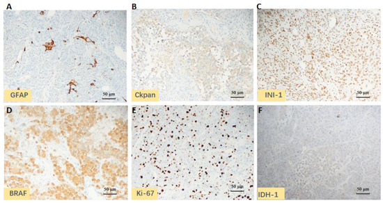 | Positive | Braf V600E, Ckpan (partial), GFAP (partial), Olig-2 (scattered), Vimentin, INI1, BRG1, S-100, Syn, P53, and Ki-67 (40%) |