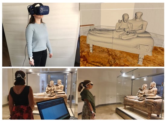 “Art experience means the rich experience of artistic objects that are mostly embedded in situational, social, and cultural contexts: for instance when encountering art in art galleries or museums” []. Such a statement stresses the relevance of the environment in which the art experience takes place, mentioning “traditional” contexts like galleries and museums. However, this notion needs to take into account the widening development of the introduction of virtual reality (VR) in museum contexts, which often regard such technology as a novel way for improving the appeal and enjoyment of the fruition of their collections [], ultimately attracting more visitors []. It has been reported that in Europe, about 35% of museums have already introduced some form of 3D presentation of objects []. The same authors also reported that relative to archaeological contexts, the opinion of museum professionals and other key experts highlighted great enthusiasm for 3D and awareness of its potential, with around 65% of archaeological museums affirming that 3D had an “important” or “very important” role to play in presenting archaeology to the public and in the study of material culture []. Such interest even led to the definition of best practices for the construction of virtual museums [] and to the development of dedicated systems, enabling the curators to set up virtual museum exhibitions []. Of course, such innovations would strongly contribute to the dissemination of artistic knowledge and enjoyment and to the cultural heritage theme, but the spontaneous questions rising from this scenario are: could a VR experience replace a real experience of an artifact? What are we gaining and what are we loosing? Is VR a hyperinformative space?