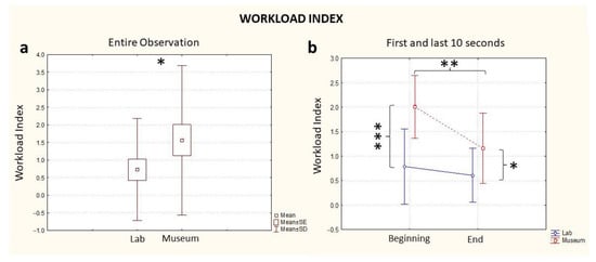 The analysis of the entire observation revealed a higher level of Workload in the museum compared to the laboratory treatment (Location, p = 0.04, Figure 2a). When performing the ANOVA considering the variables Location (Museum/Laboratory) and Time (Beginning/End), this difference was visible from the beginning of the experience: if we consider the first 10 s of observation in both contexts, the museum environment induced a higher level of Workload in the participants (Time * Location, p < 0.001, Figure 2b, Beginning). At the end of the minute of observation, the museum still elicited a higher Workload level (Time * Location, p < 0.05, Figure 2b, End) but the difference with respect to the laboratory observation was lower than the beginning. There was also a statistically significant effect of the single variables Time (p = 0.01) and Location (p = 0.03) (Table 1). A further comparison between groups on the basis of the order of observation (lab first or museum first) was investigated, with no statistically significant differences found between groups for Workload values.