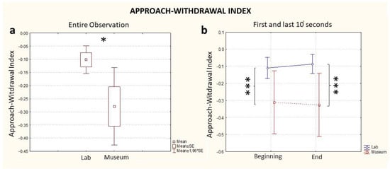EEG Approach–Withdrawal Index computed for the entire observation period (a) and during the first and last 10 s segments of the observation (b), in blue: the index computed in the lab and in red: the index computed in the museum. * stands for statistical significance at the level p ≤ 0.05; *** stands for statistical significance at the level p ≤ 0.001.