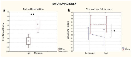 Emotional Index computed for the entire observation period (a) and during the first and last 10 s segments of the observation (b), blue: the index computed in the lab and red: the index computed in the museum. * stands for statistical significance at the level p ≤ 0.05; ** stands for statistical significance at the level p ≤ 0.01.