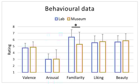 Averages of the behavioural results obtained through ratings (Likert scale 1–7) collected at the end of the entire art experience both in the lab and museum locations. * stands for statistical significance at the level p < 0.05.