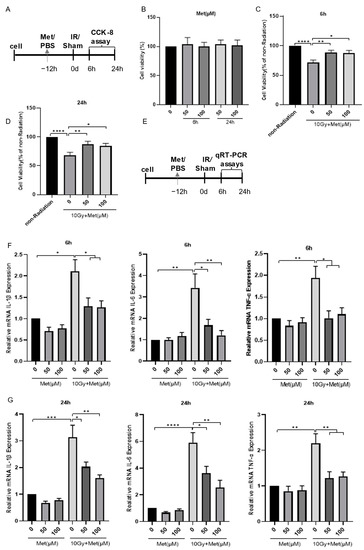 Metformin reduces radiation-induced inflammation in BV2 cells. (A) Overview of the CCK-8 assay timeline. Met, metformin; PBS, phosphate buffer solution; IR, irradiation; h, hour. (B) The effect of metformin on the viability of BV2 cells was detected by CCK-8 assays. (C,D) The effect of metformin on the proliferation viability of BV2 cells was detected by CCK-8 assays 6 (C) and 24 h (D) after 10 Gy irradiation. (E) Schematic diagram of the in vitro irradiation model (10 Gy). (F,G) The mRNA expression levels of IL-1β, TNF-α and IL-6 at the 6th (F) and the 24th h (G) after irradiation. * p < 0.05, ** p < 0.01, *** p < 0.001, **** p < 0.0001.