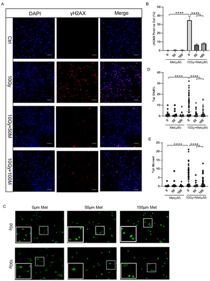It has been shown in the literature that DNA damage is one of the initial causative factors in the inflammation process in RIBI, which further leads to a reduction in the proliferative capacity of vascular endothelial or brain glial cells and causes progressive and irreversible brain damage [6]. Thus, we wondered whether metformin exerted neuroprotective effects against DNA damage in RIBI. It was well known that γH2AX can mark DNA damage sites [7]. First, we examined the effects of metformin on the expression of γH2AX early after irradiation. We found a 35% increase in the number of γH2AX-positive cells 1 h after 10 Gy γ-ray irradiation compared with the sham group (p < 0.0001; Figure 5A,B), while that rate decreased to 5% in the metformin-treated group (p < 0.0001; Figure 5A,B). In addition, comet assays were used to measure DNA damage (Figure 5C). Since the amount of DNA double-strand breaks is overall proportional to the amount of DNA in the tail compared to the DNA remaining in the head [21], the DNA damage level was quantified as the percentage of DNA in the tail (tail DNA%) and tail moment. The data demonstrated that tail DNA% and tail moment in irradiation groups were significantly increased after 10 Gy radiation when compared to the sham groups (p < 0.0001), whereas these values were significantly lower in the metformin pretreatment groups of both 50 and 100 μM groups in comparison to the irradiation groups (p < 0.0001; Figure 5D,E). Based on these findings, metformin reduced DNA damage caused by irradiation in BV2 cells.