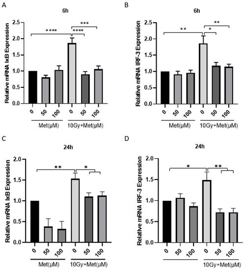 Metformin reduces the mRNA levels of IκB and IRF-3 in BV2 cells. (A,B) The mRNA expression levels of IκB (A) and IRF-3 (B) at the 6th hour (h) after 10 Gy irradiation. (C,D) The mRNA expression levels of IκB (C) and IRF-3 (D) at the 24th h after 10 Gy irradiation. Met, metformin. * p < 0.05, ** p < 0.01, *** p < 0.001, **** p < 0.0001.
