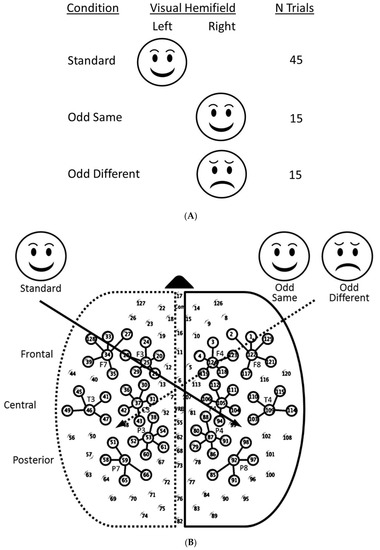 On each of the 75 randomly ordered trials, infants were presented at 50 cm first with a salient centering animated attention-getter. When the infant was judged to be fixating centrally, the attention-getter was removed, and a stimulus was presented peripherally for 250 ms. The brevity of stimulus exposure ensured that infants could not shift their gaze from central to peripheral to fixate on the peripheral stimulus centrally [11]. Stimulus presentation was followed by a random-duration, inter-trial interval (ITI) during which the screen was uniformly black; ITIs varied in duration from 1800 to 2200 ms. Next, the centering attention-getting animation was re-presented. The stimulus sequence followed a modified oddball paradigm with three trial conditions: one standard same-trial and two different odd-trial conditions. On standard trials, the same stimulus was presented in the same hemifield each time over the course of 45 trials. Randomly interleaved among the standard trials, 30 odd trials presented stimuli in the opposite hemifield. One-half (15) of the trials applied the same stimulus used on standard trials (odd-same), and the other half (15) of the trials applied the novel stimulus (odd different). The facial expression and presentation hemifields, which were used as the standard, were counterbalanced across infants.