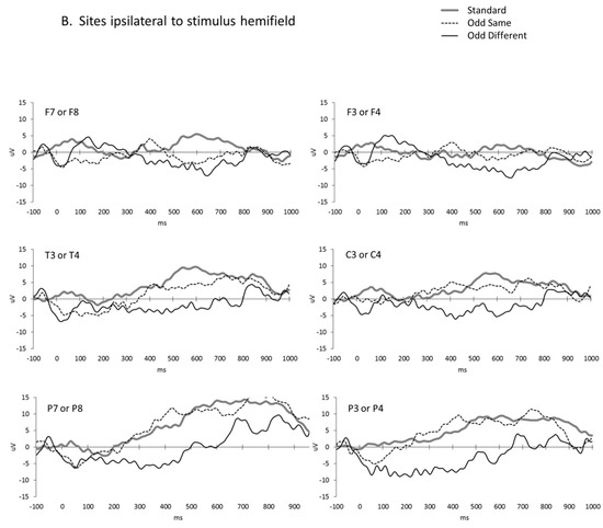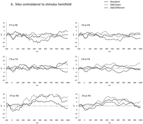 The main analysis included all of the trials and consisted of an ANOVA incorporating three within-subject factors: the trial condition (planned contrasts of standard vs. odd-same and odd-same vs. odd-different), brain hemisphere (ipsilateral to the presentation hemifield vs. contralateral), and scalp site (frontal vs. central vs. posterior). Three of the site contrasts were significant, with frontal sites having smaller amplitudes than both central (F(1,11) = 8.33, p = 0.015, ηp2 = 0.431) and posterior (F(1,11) = 20.41, p = 0.001, ηp2 = 0.650) sites and central sites having smaller amplitudes than the posterior sites (F(1,11) = 18.40, p = 0.001, ηp2 = 0.626). The trial condition contrast between the standard and odd-same trials was not significant (F(1,11) = 0.00, p = 0.996, ηp2 = 0.000), but the amplitude of the response to the odd-different trials peaked negatively and differed significantly from the amplitude to the odd-same trials (F(1,11) = 8.34, p = 0.015, ηp2 = 0.431). Figure 3 shows the significant interhemispheric transfer effect.
