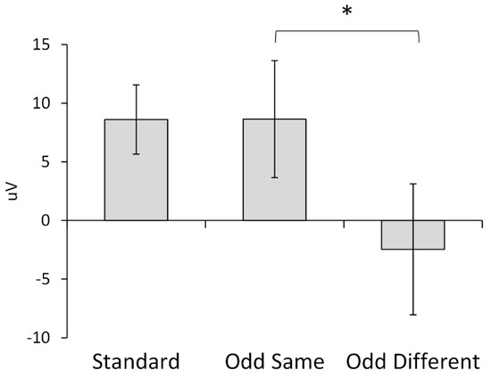 Mean response amplitude showing difference between odd-same and odd-different conditions (* p < 0.05).