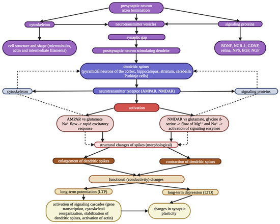 The integrity of different brain areas, which is supported by synaptic plasticity, is a prerequisite for proper brain maturation and proper formation of neuronal circuits. Two major opposite forms of synaptic plasticity, long-term potentiation (LTP) and long-term depression (LTD), associated with changes in AMPA (α-amino-3-hydroxy-5-methyl-4-isoxazolepropionic acid) and NMDA (N-methyl-d-aspartate) receptors, are usually present in parallel in synapses in response to different patterns of activation [1,16,17,18]. Consequently, the result of properly functioning neuronal circuits is the proper reception and adequate interpretation of external and internal stimuli (cognitive, motor, sensory) [19,20]. The neuroplasticity network (Figure 1) includes various mechanisms that allow the brain to change through growth and reorganization [21]. These changes range from individual neurons making new connections and learning new abilities to systematic, complex adjustments like cortical remapping.