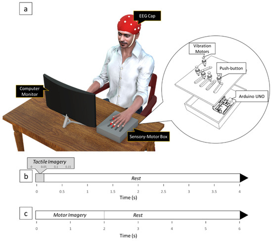 A sensory-motor box (Figure 1a) was constructed to aid the subjects in their TI and MI training. The box consisted of three push buttons with small flat vibration micro motors (Sunrobotics, Gujarat, India) attached on top of the buttons. Adjustable sliders were integrated into the box to align each button with the corresponding digit pads. The vibration motor produced a 27-Hz sine wave, which fell within the frequency range to stimulate the Pacinian and Meissner corpuscles [32]. The sensory-motor box was controlled by an Arduino UNO R3 microcontroller (Arduino, Ivrea, Italy).