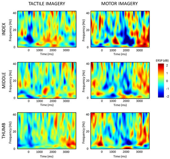 The present study involved conducting trials to investigate tactile and motor imagery using digits on the left hand. The experiment measured brain activity through EEG in order to study the activation of the sensorimotor area during these tasks. Figure 2 illustrates the grand average time–frequency maps of all subjects at C4, for all three hand digits under both imagery conditions. The time–frequency maps demonstrate ERD as a decrease in power in the alpha and beta frequency bands during imagery. For TI, a 150 ms vibratory stimulus was imagined at 0 s, resulting in a band power decrease that was consistent across all trials in C4. The maximum cortical activity in the form of ERD was observed at around 500 ms after the vibrotactile sensory imagination for all three digits. Similarly in MI, a long-lasting ERD was seen at the onset of the digit task and lasted for the 2 s duration the task was imagined.