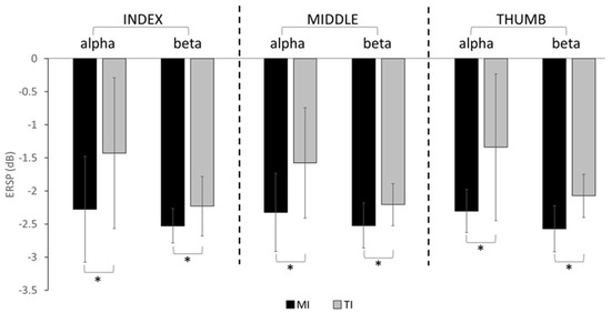 In the alpha band, a repeated measures ANOVA showed that ERD significantly differed by the main effect of imagery condition (TI vs. MI) (p = 0.014), but not by digit (index, middle, and thumb) (p = 0.647), or their interactions (p = 0.771). Post hoc Bonferroni tests demonstrated that ERD (Figure 4) was significantly higher in MI than TI for the index (p = 0.023), middle (p = 0.041), or thumb (p = 0.011) digits.