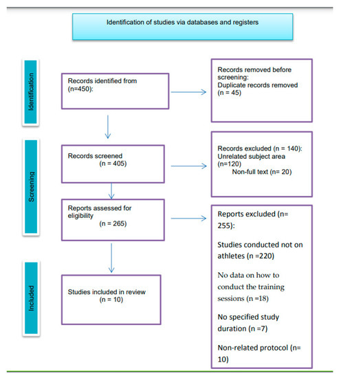 First, 450 studies were identified. After removing duplicates, 405 (n) remaining trials were screened for eligibility. Then, 140 studies were excluded because they were not about neurofeedback in sports, focused on unrelated subject areas (n = 120) or did not have an available full text (n = 20). Finally, according to our inclusion/exclusion criteria, 10 studies were considered acceptable for this literature review (Figure 2).
