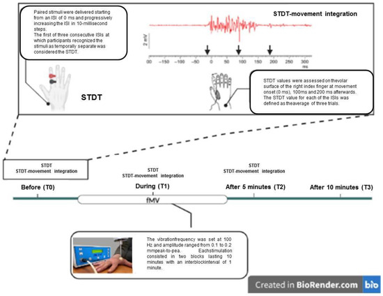 All subjects participated at this experiment. STDT and the STDT–movement paradigm were tested prior to, during and after the application of fMV over the FDI muscle, which was involved in the motor task underlying STDT–movement integration. In particular, the STDT at rest and the STDT–movement paradigm were tested at the beginning of each experimental session (T0), during the second block of fMV (T1) and 5′ (T2) and 10′ (T3) after fMV. FMV was applied to generate a 0.1 mm peak-to-peak sinusoidal displacement. For the STDT–movement paradigm, the different intervals (0, 100 and 200 ms) between movement onset and the STDT testing were selected in a randomized order for each subject (Figure 1).