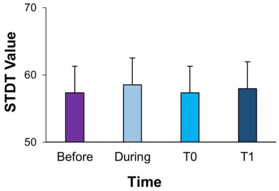 STDT values measured at rest at four different time points: before (T0), during (T1) and 5′ (T2) and 10′ (T3) after focal muscle vibration (fMV). FMV did not induce significant changes in STDT values at rest.