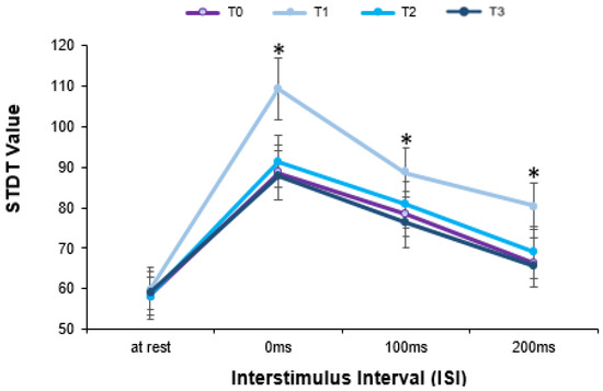 The one-way RM-ANOVA performed to investigate changes in STDT values while fMV was applied over the FDI failed to detect a significant effect of the time factor (F(3,39) = 1.239; p = 0.299, ηp2 = 0.072), showing no differences in STDT values measured at rest before, during or after fMV (Figure 2). The two-way RM-ANOVA, performed to compare STDT–movement integration before, during and after fMV was applied over the FDI, showed significant effects of ISI (F(3,39) = 57.739; p < 0.001, ηp2 = 0.783), time (F(3,39) = 34.894; p < 0.001, ηp2 = 0.686) and interaction between factors (F(9,117) = 8.69; p < 0.001, ηp2 = 0.352) (Figure 3). First, the post hoc analysis showed a significant increase in STDT values at different ISIs from movement onset compared to at rest, showing significant changes in STDT values during movement as well as before (rest vs. 0 ms: p < 0.001; rest vs. 100 ms: p < 0.001), during (rest vs. 0 ms: p < 0.001, rest vs. 100 ms: p < 0.001 and rest vs. 200 ms: p = 0.01) and after (rest vs. 0 ms: p < 0.001, rest vs. 100 ms: p < 0.001 and rest vs. 200 ms: p = 0.04) fMV. Moreover, the post hoc analysis showed that STDT–movement integration at T1 (during fMV) significantly differed from that at T0 (before fMV) (p = 0.001). Similarly, STDT–movement at T2 (5 ‘ after fMV) (p < 0.001), as well as at T3 (10′ after fMV), was significantly different from that at T1 (during fMV) (p < 0.001). Finally, the post hoc analysis showed a significant effect of fMV on STDT modulation only “during” fMV at all the ISIs (0 ms, 100 ms and 200 ms) after index finger abduction (all p < 0.05).