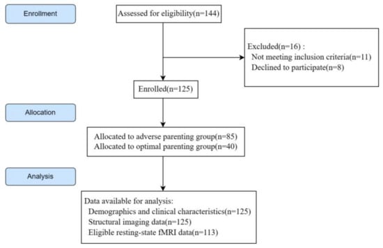 MDD patients were selected from the Early Warning System and Comprehensive Intervention for Depression (ESCID) project. We calculated the sample size using G*Power software (latest ver. 3.1.9.7; Heinrich-Heine-Universität Düsseldorf, Düsseldorf, Germany). Informed consents for 8 participants were withdrawn, and 11 participants did not meet the inclusion criteria. One hundred and twenty-five MDD outpatients were recruited between May 2019 and April 2022. The inclusion criteria were: (1) being aged 18–50 years; (2) meeting DSM-5 diagnostic criteria for MDD diagnosed by two experienced psychiatrists; and (3) having a junior high school education or higher. Exclusion criteria were: (1) mental health disorders other than MDD diagnosed according to the DSM-5; (2) a history of organic brain disease; (3) severe stupor or other symptoms that could interfere with the study; (4) transcranial magnetic stimulation (TMS) or electroconvulsive therapy (ECT) treatment within the prior six months; and (5) pregnancy (Figure 1).