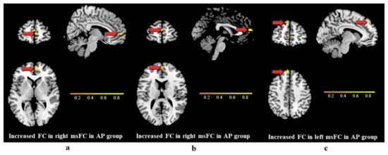 The images show increased FC from the right SPL (ROI 1) to the bilateral medial superior frontal cortex (smFC) in the AP group compared with the OP group at rest. In the DMN, voxel-wised FC between the right SPL and the right smFC were significantly different between the AP group and the OP group (a). In the DMN, voxel-wised FC between the right SPL and the right smFC increased in the AP group (b). In the DMN, voxel-wised FC between the right SPL and the left smFC also increased in the AP group (c). The red arrow shows the corresponding brain region. The right SPL was set as the seed because the GMV of this region was increased in the AP group (see Figure 2).