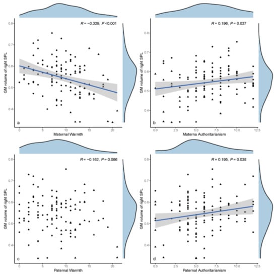 A negative correlation between the GMV of the ROI and maternal warmth scores (r = −0.329, p < 0.001) and a positive correlation between the GMV of the ROI and parental authoritarianism scores (for mother: r = 0.196, p = 0.037; for father: r = 0.195, p = 0.038) were observed. The GMV of the ROI is negatively correlated to maternal warmth scores (r = −0.329, p < 0.001) (a). The GMV of the ROI is positively correlated to maternal authoritarianism scores (r = 0.196, p = 0.037) (b). There is no significant correlation between the GMV of the ROI and paternal warmth (c). The GMV of the ROI is positively correlated to paternal authoritarianism scores (r = 0.195, p = 0.038) (d). The triangle represents the AP group and the circle represents the OP group. The density curves represent the distribution of the variables.