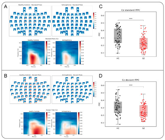Topography of intertrial phase coherence as well as coherence in electrode Cz for standard (A) and deviant (B) tones and their group differences (C,D), respectively. The black boxes in (A,B) indicate the range for which ITPC was calculated by averaging over values in time and frequency domain; *** < 0.001.