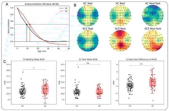 (A) Depiction of autocorrelation functions for one healthy participant and one schizophrenia patient. Autocorrelation was measured as the lag where the decay of the autocorrelation function reaches 50 percent. (B) Topographical distribution of ACW calculated from resting and task states as well as rest–task difference. (C) Group differences in ACW rest, task and rest–task difference; * < 0.05, *** < 0.001, ns. = not significant.