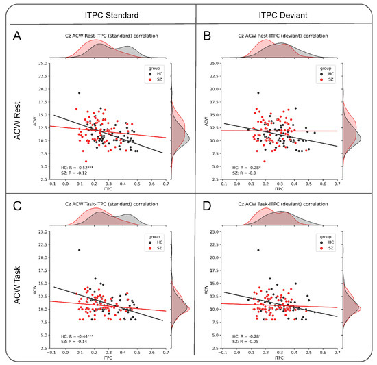 The following supporting information can be downloaded at: https://www.mdpi.com/article/10.3390/brainsci13040695/s1, Figure S1: Correlation of ITPC and ACW rest–task difference.
