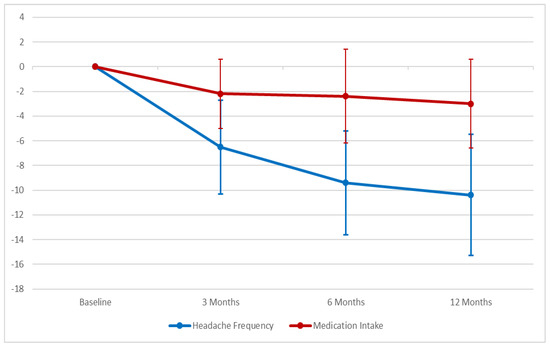 Figure 1 reports the description of change over time for headache frequency and medication intake from baseline at months 3, 6, and 12. It can be appreciated that the range of variation from baseline is below zero for headache frequency, whereas it always included zero for medication intake.