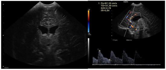 Sagittal and coronal US showing dilated lateral ventricles. Echocolordoppler showed augmented resistance and pulsatility indexes, speaking in favor of augmented intracranial pression.