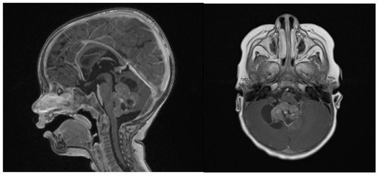 Clinical examination did not show any anterior fontanel bulging nor trismus. Whole brain and spine magnetic resonance imaging (MRI) was performed, showing a heterogeneous cystic-hemorrhagic lesion, partially calcified, in the posterior fossa, Measuring 46 × 34 × 49 mm and obstructing the IV ventricle and right Luschka foramen (Figure 2).