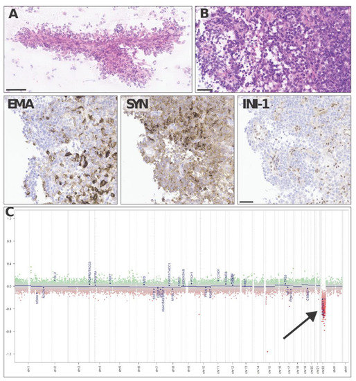 Representative haematoxylin–eosin images of an intraoperative cytologic smear (A) andparaffin-embedded histological sections (B) show a densely cellular solid–papillary tumor, made up of tumor cells positive with epithelial membrane antigen (EMA) and synaptophysin (SYN) and showing loss of INI-1 (SMARCB1) on immunostains. Copy number variation predictions (C) show a flat profile with a heterozygous loss of 22q harboring SMARCB1 (arrow in C). Scale bars = 100 µm (A) and 50 µm (B, EMA, SYN, INI-1).