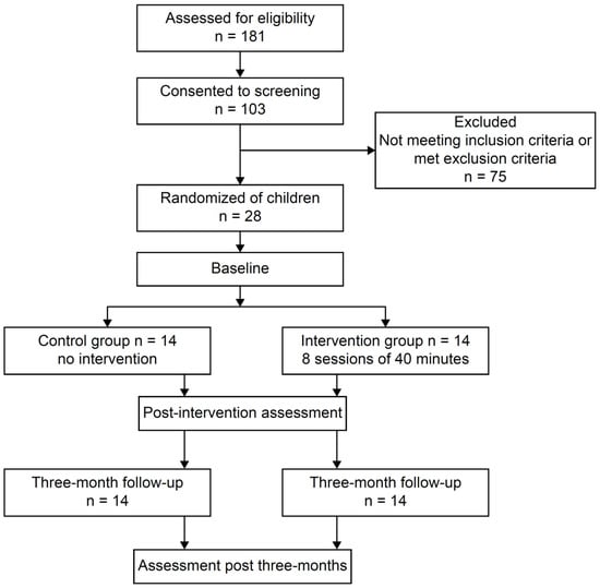 Based on this screening process, 28 children with total DCDQ-J scores of <40 points met our study’s inclusion criteria. The 28 children were randomly assigned to two groups to prevent bias. Random numbers were generated using Excel; odd numbers were assigned to the control group (n = 14) and even numbers to the intervention group (n = 14). The threshold of a total score of ≤40 points in the DCDQ-J was based on the data from five-year-old boys [22].