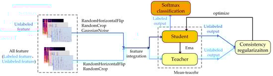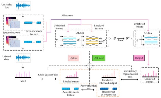 The semi-supervised AE–MT model constructed in this paper comprises two parts: the AE–Stu model and the AE–Tea model. The parameters of the AE–Stu model are expressed by and the parameters of the AE–Tea model are expressed by . The AE–MT model flowchart is shown in Figure 5.