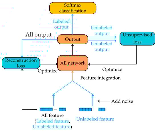 In this paper, we collected some labeled data , and a large number of unlabeled data , where was the label, , the total number of samples was , , and , respectively, representing the total number of labeled data and unlabeled data. In this paper, the labeled data was recorded as , and the unlabeled data was recorded as . Among them, were labeled input and unlabeled input of the semi-supervised AE network, with ; were labeled input and unlabeled input of mean-teacher model, respectively, with .