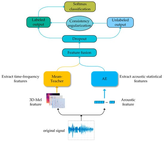 The proposed model framework is shown in Figure 1. The model applied the semi-supervised AE to obtain the depth acoustic statistical features, used the semi-supervised mean-teacher model based on the CNN network to extract the depth time-frequency two-dimensional features, and then employed the consistent regularization methods to constrain the fusion of the output features of the two semi-supervised networks to suppress the model over-fitting. Each module is described as follows.