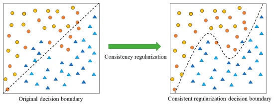 The feature fusion method integrates different types of features to make up for the differences between features but also leads to the problem of dimension disaster, which will cause over-fitting and affect the classification ability of the model. Refs. [,,] show that the consistency regularization method can utilize the potential information of unlabeled data and improve the generalization ability of the semi-supervised model. Meanwhile, to solve the problem that the perturbed fusion features are easily misclassified by the model, this algorithm introduces a consistency regularization method. As shown in Figure 6, although the original decision boundary is not enough to distinguish the perturbed features, the perturbed features are also correctly classified after optimization by the consistent regularization method.