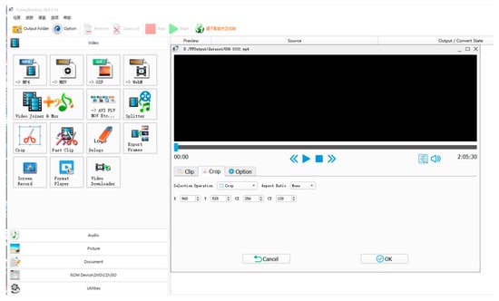In order to complement the existing corpus of deception detection and verify the effectiveness of the AE–MT model proposed in this paper, we built the H-Wolf corpus for speech deception detection experiments by referring to the construction process of the Idiap Wolf database [], and the Killer database []. We collected about 70 h of the “Werewolves of Miller’s Hollow” competition video, which can be found on the internet, and screened video clips containing truth and lies according to the ID card of players and competition rules in each werewolf killing competition. Firstly, we used free audio and video editing tools, as shown in Figure 7, to intercept video clips related to truth or lie. We then used Adobe Audition, an audio processing software, to separate the audio from the video and display the audio waveform and spectrogram, which can be seen in Figure 8. Finally, we imported the audio clip using Adobe Audition software and modified its sample rate to 48,000 Hz, changing its bit depth to 16 bits. The number of players in each “Werewolves of Miller’s Hollow” competition is 12, and one player can participate in multiple competitions. After screening and statistics, the detailed number of participants is shown in Table 4. After multiple people tests, we retained clear and recognizable speech extracts, obtaining 1103 speech extracts (521 deception speech extracts). Then we divide them by 9:1 to obtain 992 training data and 111 test data.