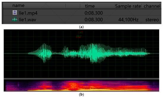 The extraction process of audio by Adobe Audition. (a) shows the separation of audio and video, and (b) shows the audio waveform and spectrogram.
