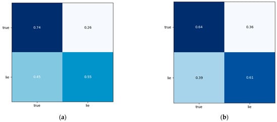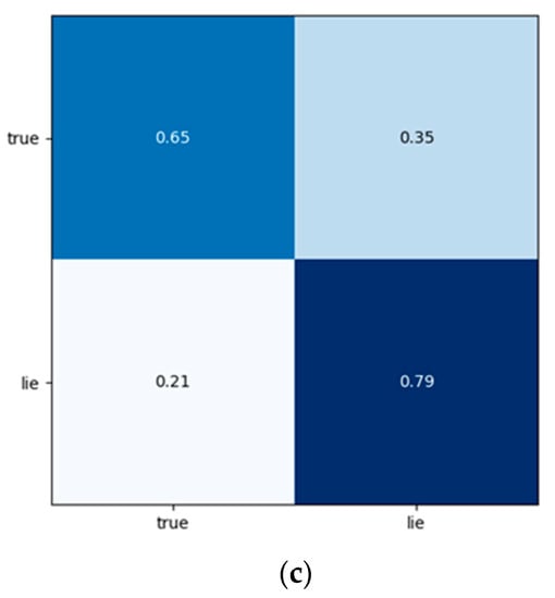To further study the recognition accuracy, we introduced the confusion matrix to analyze the model. On the H-wolf dataset, we made the confusion matrix as shown in Figure 9. When the number of labeled data was 200, the recognition rate of truth and lies was 74 and 55%, respectively; when the number of labeled data was 400, the recognition rate of truth and deception was 64 and 61%, respectively; when the number of tags was 600, the recognition rate of truth and lies was 65 and 79%, respectively. Of these, the recognition rate of the truth was higher than 64%, and the accuracy rate of the lies was higher than 55%. With the increase in the number of labeled data, the recognition ability of the model to identify the lies was significantly improved.