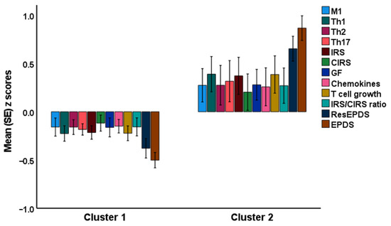 Results of cluster analysis performed on EPDS (Edinburgh Postnatal Depression Scale) scores and immune profiles. M1: macrophage M1, Th: T helper, IRS: immune-inflammatory response system, CIRS: compensatory immunoregulatory system, GF: growth factors, ResEPDS (residualized EPDS after covarying for psychological stressors). All measurements (except CIRS) are significantly higher in cluster two than in cluster one.