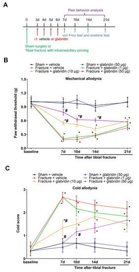 Pretreatment with glabridin via the intrathecal route decreases the initiation of fracture-associated allodynia. (A) Experimental designs to explore the preventive properties of glabridin on prolonged pro-nociception in a mouse model of tibial fractures. The behavioral phenotypes of mechanical allodynia (B) and cold allodynia (C) were observed. All behavioral results are shown as means ± SEM (n = 6) and analyzed by a two-way ANOVA with Bonferroni post hoc comparisons. * p < 0.05 vs. group sham + vehicle; # p < 0.05 vs. group fracture + vehicle; i.t., intrathecal.