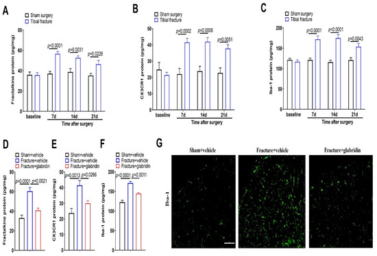 Chemokines and their receptors in the dorsal horn mediate microglia activation and neuroinflammatory responses, which is an essential hallmark of chronic allodynia after nerve injuries and bone cancer [9,10]. Herein, in the ELISA experiments, as compared to the sham operations, the spinal up-modulations of fractalkine, CX3CR1, and Iba-1 (a marker of microglia) expressions occurred on day 7, peaked on day 14, and lasted for more than 21 days in the animals subjected to fractures (p < 0.05; n = 5; Figure 2A–C), which was consistent with the time course of persistent allodynia behaviors. Together, these suggest that tibial fractures with orthopedic repairs induce long-lasting overexpressions of fractalkine and CX3CR1, as well as microgliosis in the dorsal horn, which is implicated in the neuropathophysiological process of chronic allodynia.