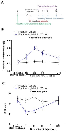 Post-treatment with glabridin via the intrathecal route attenuates the existing prolonged allodynia caused by the tibial fractures. (A) Experimental designs to explore the therapeutic properties of glabridin on the established persistent allodynia in the mouse model of tibial fractures. The behavioral phenotypes of mechanical allodynia (B) and cold allodynia (C) were recorded. Results are shown as means ± SEM (n = 6) and analyzed by a two-way ANOVA with Bonferroni post hoc comparisons. * p < 0.05 vs. group fracture + vehicle; i.t., intrathecal.
